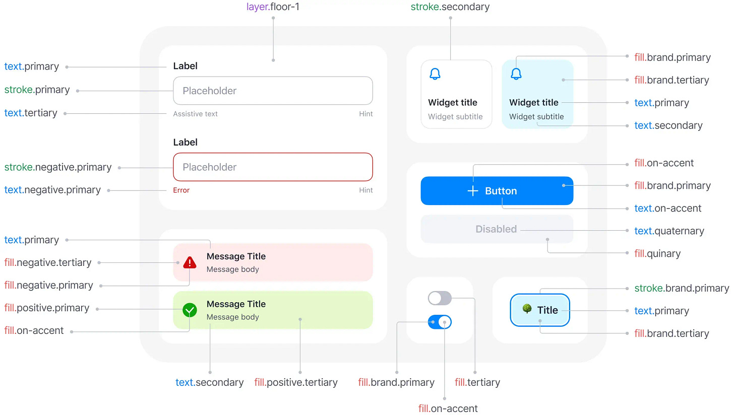 Alexandra Basova showed how to simplify the semantic color palette and make it more flexible. She suggests creating and naming color tokens not for each design component, but for entire groups at once. There are five color usage groups in total: Text, Fill, Stroke, Layer and Effect.