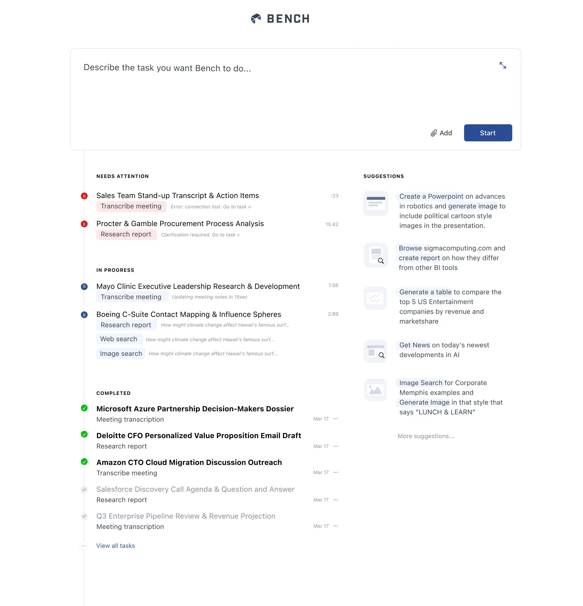 As an alternative, he showed the interface of the Bench service, which, with the help of accurate personalized prompts, helps to perform real work tasks.
