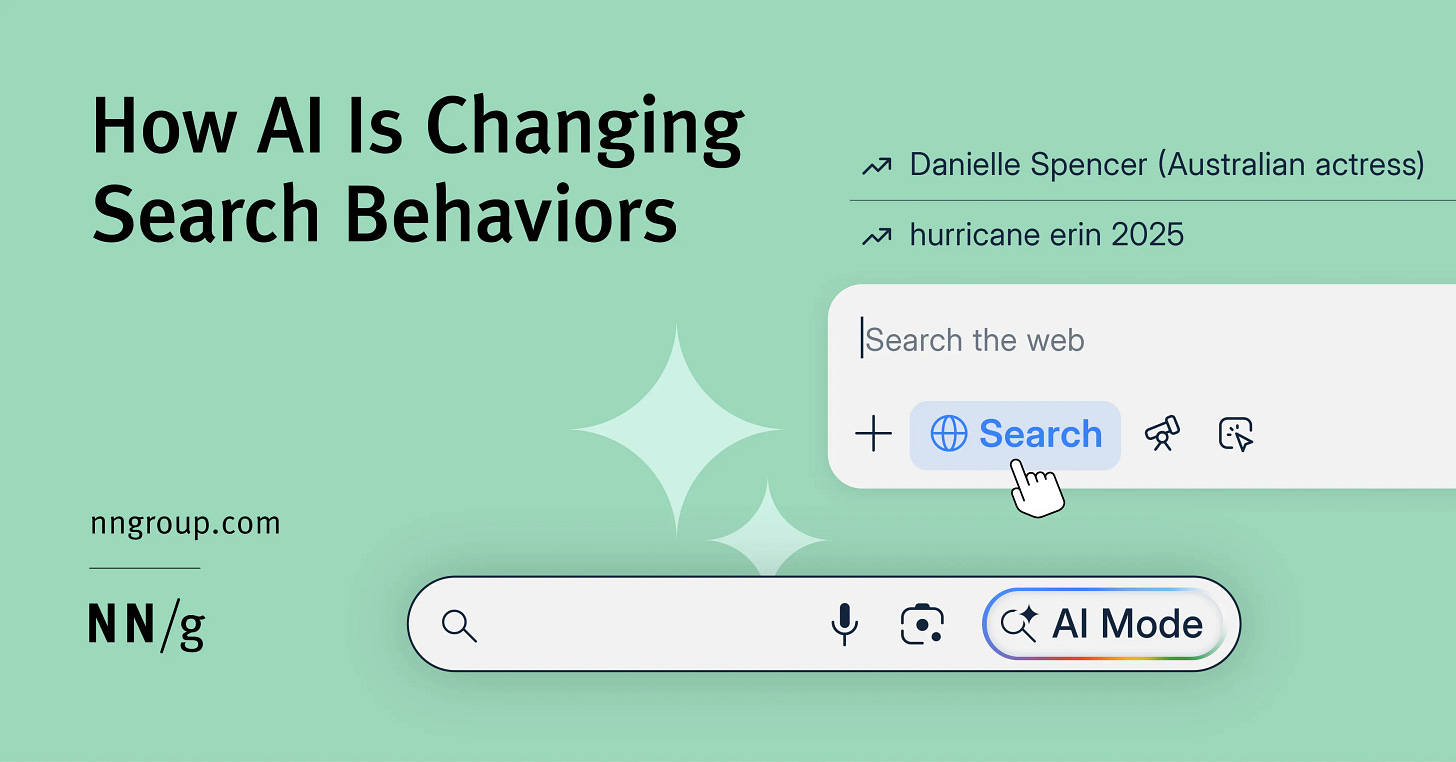 NNGroup conducted a study and described how AI affects user information search patterns. People combine AI tools with regular search and are in no hurry to switch completely to AI due to lack of motivation and experience.