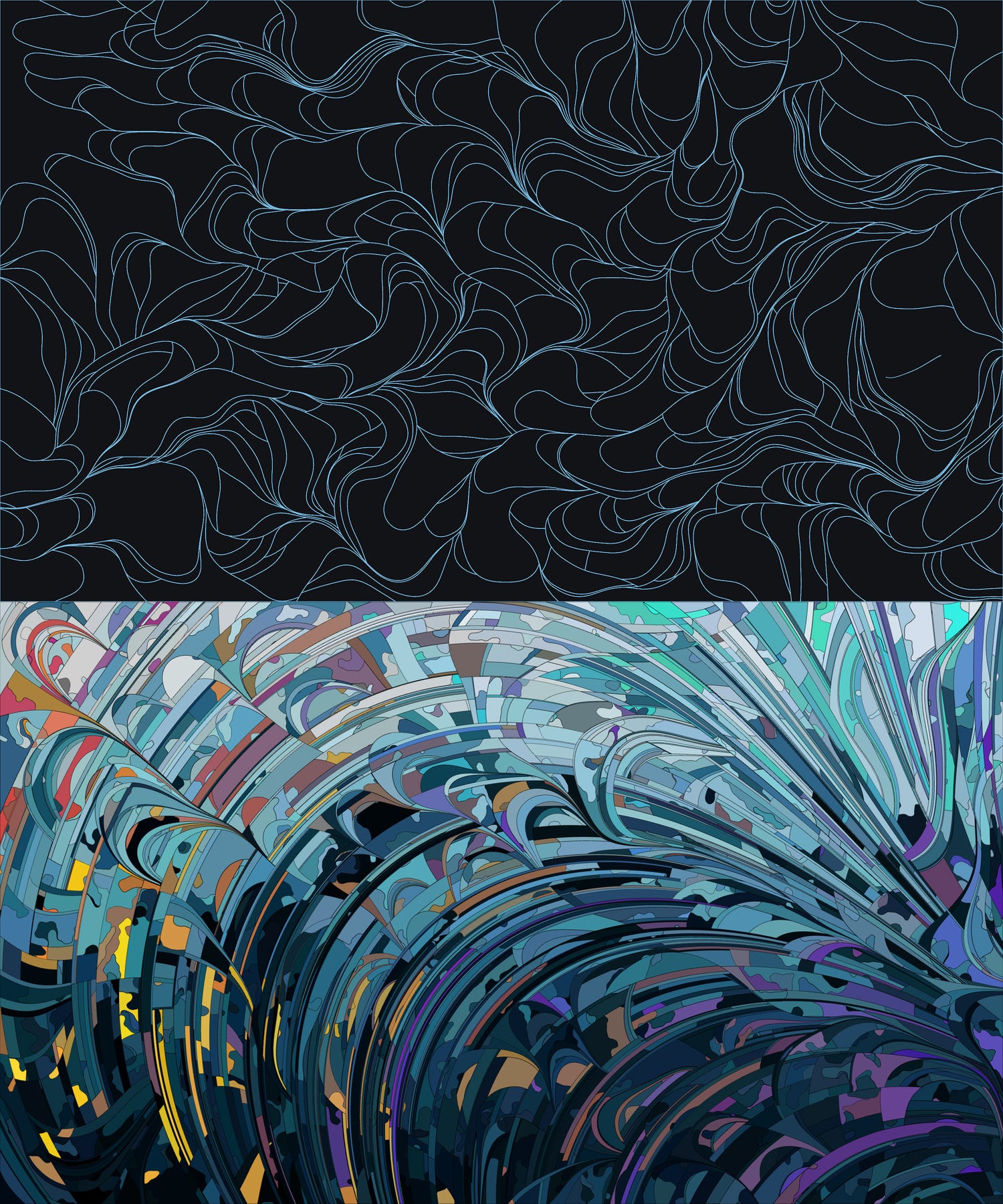 First, the algorithm animates points that move across the canvas and leave vector paths behind them. When vector paths fill the canvas, the algorithm connects their intersections on the canvas and defines closed shapes for coloring.