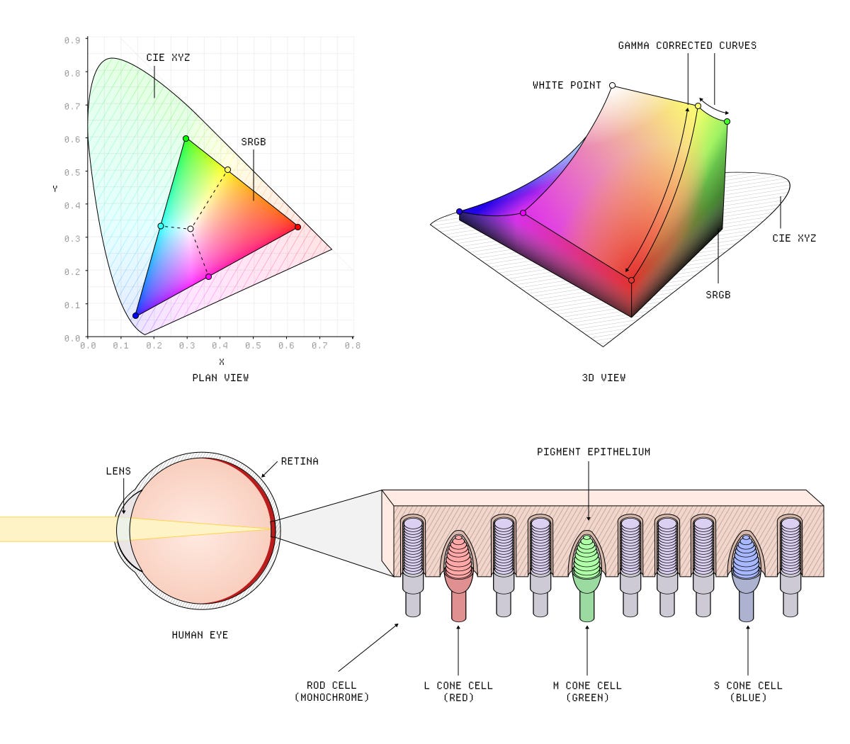 A large technical article on digital color display — from the perception of light by the eye to the arrangement of color spaces, gamma settings and color management on devices. With the help of visual illustrations, the authors show why color in the digital space is always a compromise between mathematics, biology and technical limitations.